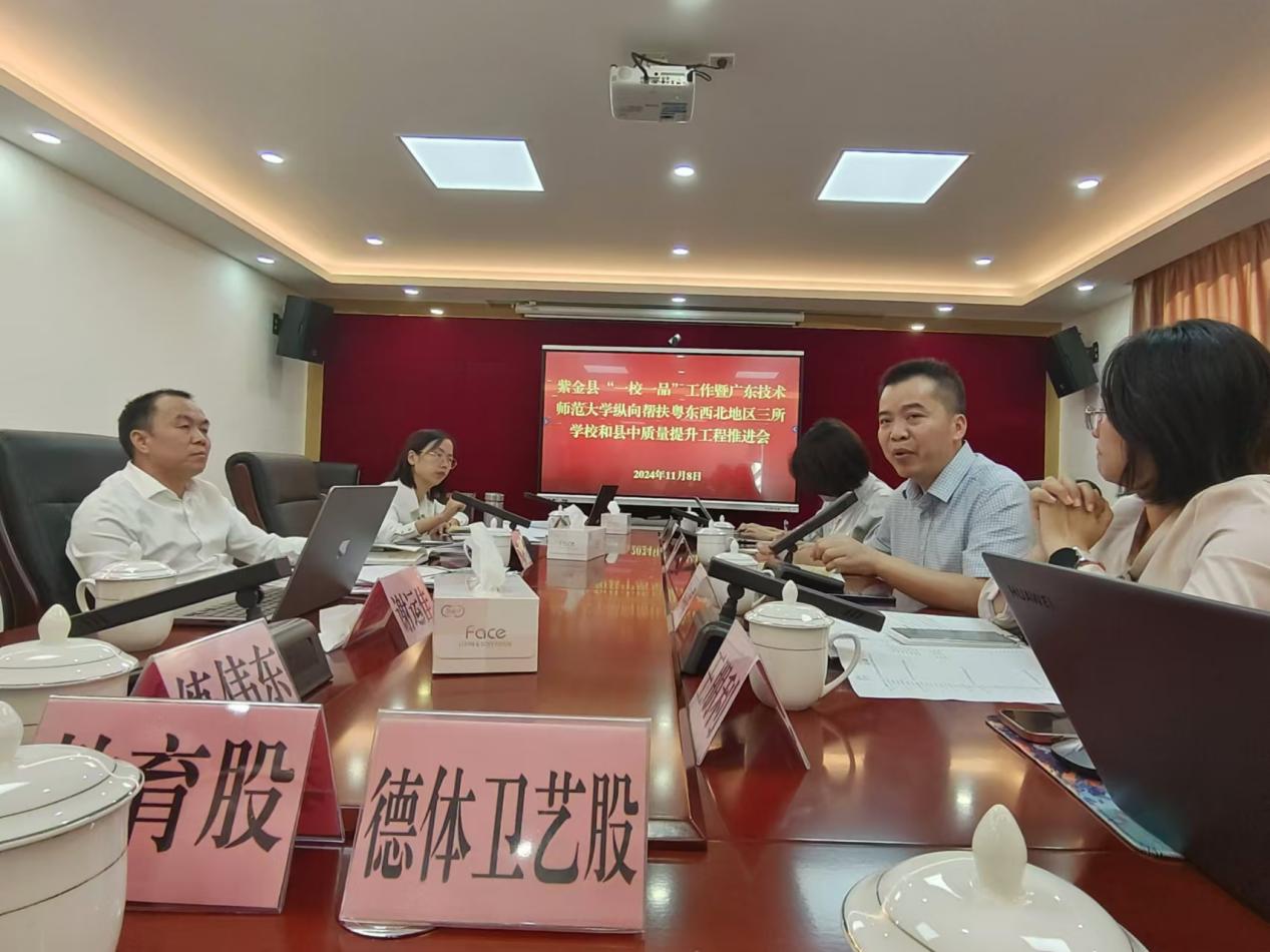 为深入贯彻落实《广东省师范院校纵向帮扶欠发达地区“三所学校”和县中质量提升工作方案(2024-2027年)》,扎实推进买球App软件手机在线下载与河源市签订的《师范院校纵向帮扶“三所学校”和县中框架协议》《全方位全口径融入式结对帮扶协议(2021-2025 年)》落地见效,11月6日至8日,教育科学学院专家组一行13人前往紫金县调研,与紫金县教育局共同召开“师范院校纵向帮扶粤东西北地区三所学校和县中质量提升工程暨一校一品”工作推进会。河源市教育局副局长黄汝荐、河源市教师发展中心主任助理谢运佳、紫金县教育局副局长谢晓玲、德体卫艺股、教育股负责人,教育科学学院杨定玉教授、曹宇星副教授、付平博士、王朋利博士、钟佳容博士以及当地相关中小学(幼儿园)书记、校长(园长)出席会议。会议由谢晓玲主持。