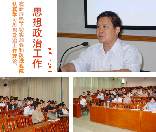 6月26日,学院政工干部培训班举行集中学习。党委副书记黄晋生同志为全体政工干部作了题为《认真学习思想政治工作这门科学,在新形势下切实加强和改进我院的思想政治工作》的主题报告。报告内容共分为八个部分,详细论述了我党开展思想政治工作的历史与优势,思想政治工作的基本规律、工作方法和根本目的,探索了新形势下开展思想政治工作的规律和方法。这对我院全体政工干部、尤其是年轻的政工干部们,在进一步了解和认识思想政治工作的过程有着重要的启发作用。