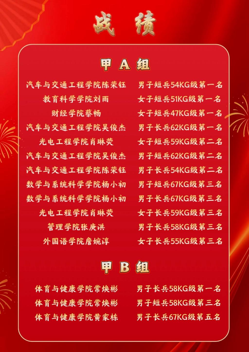 5月25日至6月1日,由中国学生体育联合会主办的第四届中国大学生武术长短兵锦标赛在天津市武清区举行,买球官网学生武术长短兵代表队获得五金三银六铜的骄人成绩,并获团体总分第二名和体育道德风尚奖,付翔老师被评为优秀教练员。获得第一名的陈荣钰、刘雨、肖琳荧、吴俊杰、常焕彬五名同学还获得了亚洲大学生武术锦标赛的入场券,将于6月17日参加首届亚洲大学生武术锦标赛,在国际赛场上继续展现广师大学子的风采。