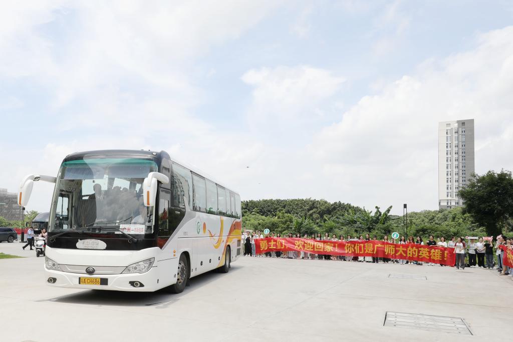 “热烈欢迎广师大男子足球队凯旋”“王者之师,胜利归来,欢迎足球英雄”“团结拼搏,勇攀高峰,荣耀归来,我们是冠军”“足球百分百,鸡腿加酸奶”,白云校区巨大的横幅热烈欢迎全国大学生足球冠军广师大男足队凯旋。