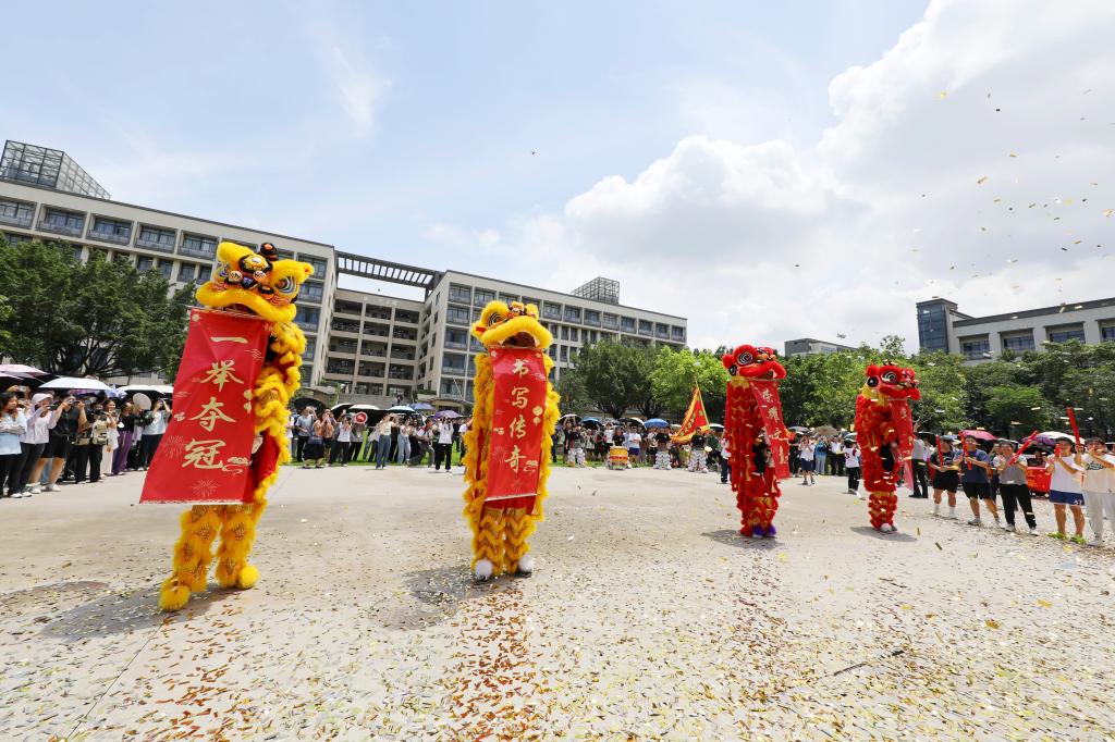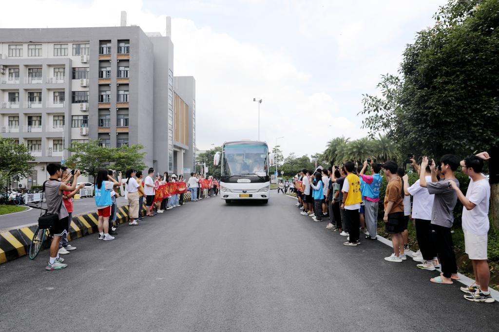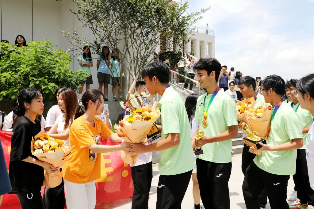 “冠军!冠军!”在现场的热烈欢呼声中,全校2000多名师生用1000支玫瑰,组成迎宾大道,在通往图书馆的路上夹道欢迎。
