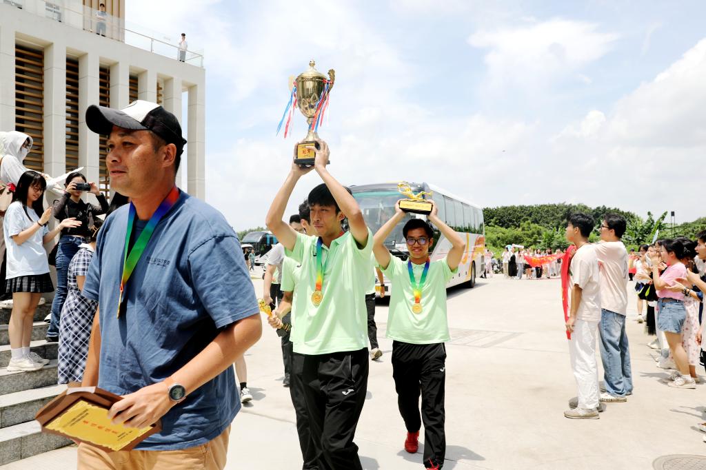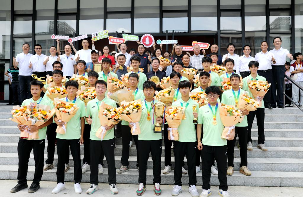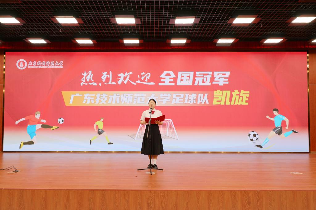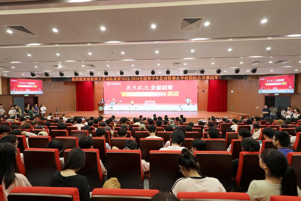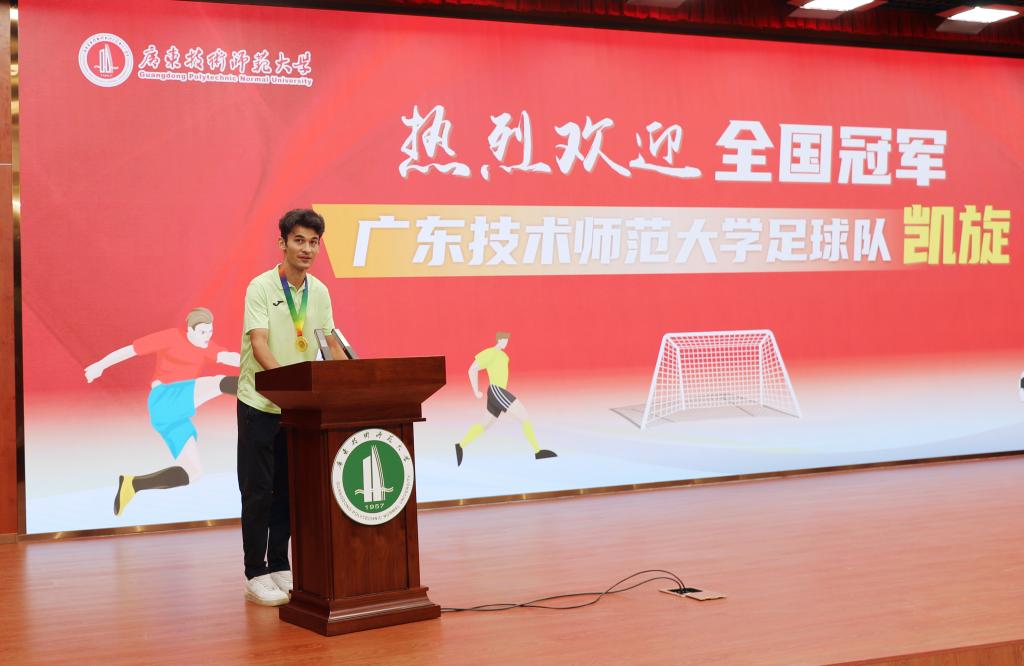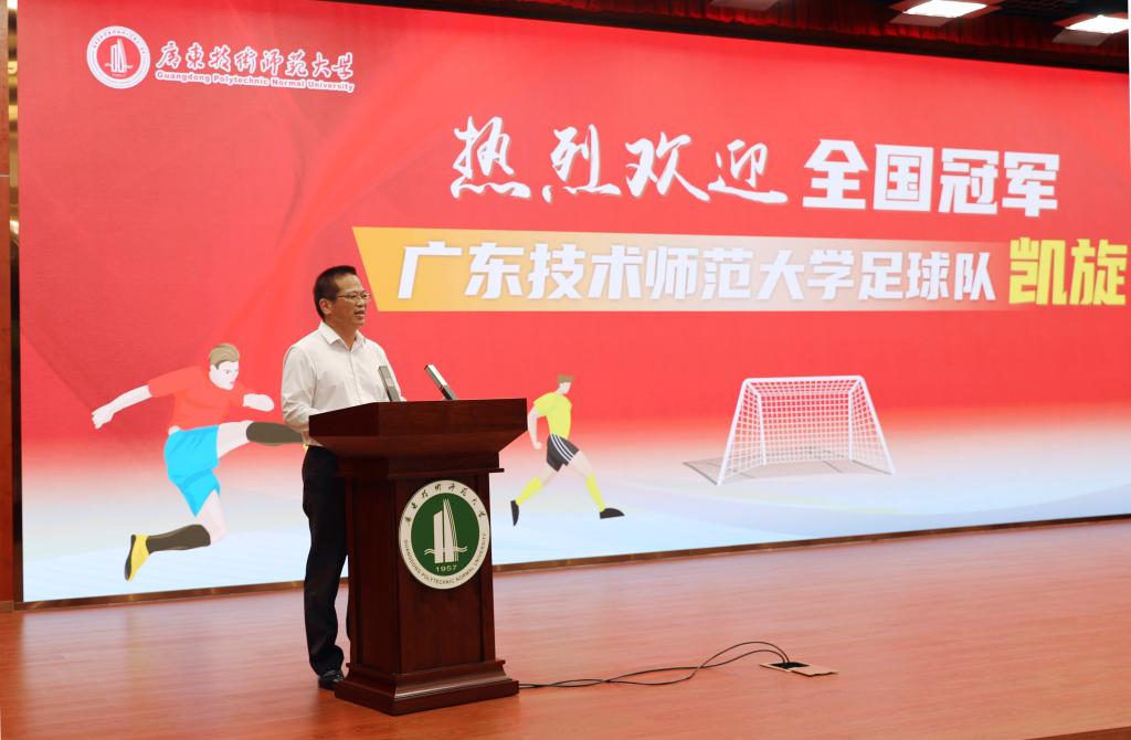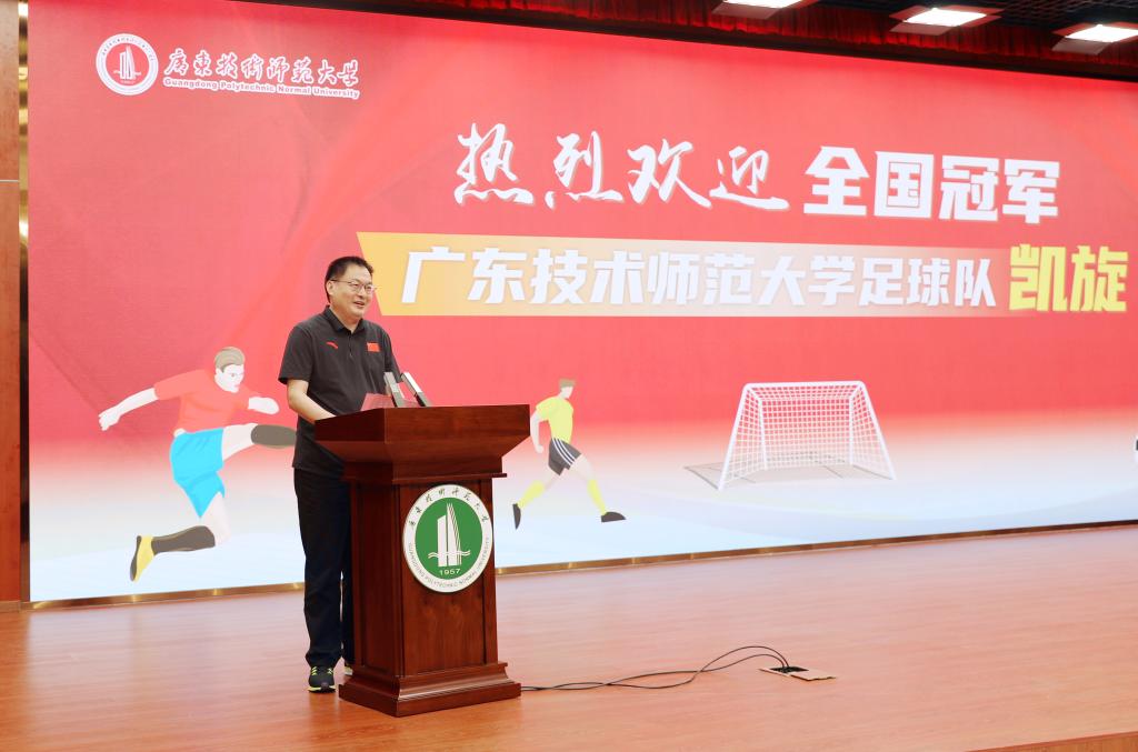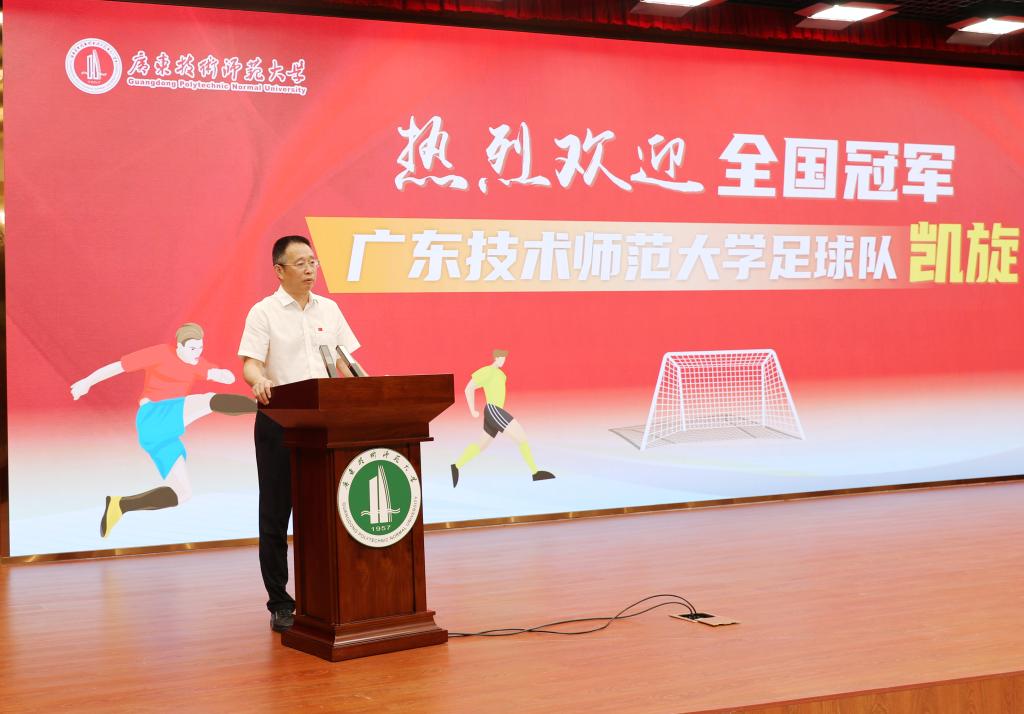 6月17日中午,广师大男足队凯旋仪式在白云校区图书馆一楼报告厅隆重举行。广东省委教育工委委员、省教育厅党组成员、副厅长程大欣,广东省体育局副厅级干部雷检军,广东省足球协会主席谢昌晶,广东省足协常务副主席兼秘书长邓欢欢,广东省足协副主席、原中国女足队员赵利红,广东省足协理事、原中国男足队员王惠良,原中国男足队员冯潇霆,省足协副秘书长邝甫祥;学校党委副书记、校长戴青云,党委副书记李向明,副校长黄秋文、苏晖、孙燕青;学校原党委书记郭斯淦,原党委副书记、校长郭杰,省政协委员、原党委书记凌靖波;学校男子足球队全体教练员、队员,学校职能部门负责人,体育与健康学院全体教师、学生代表,各学院师生代表参加仪式。