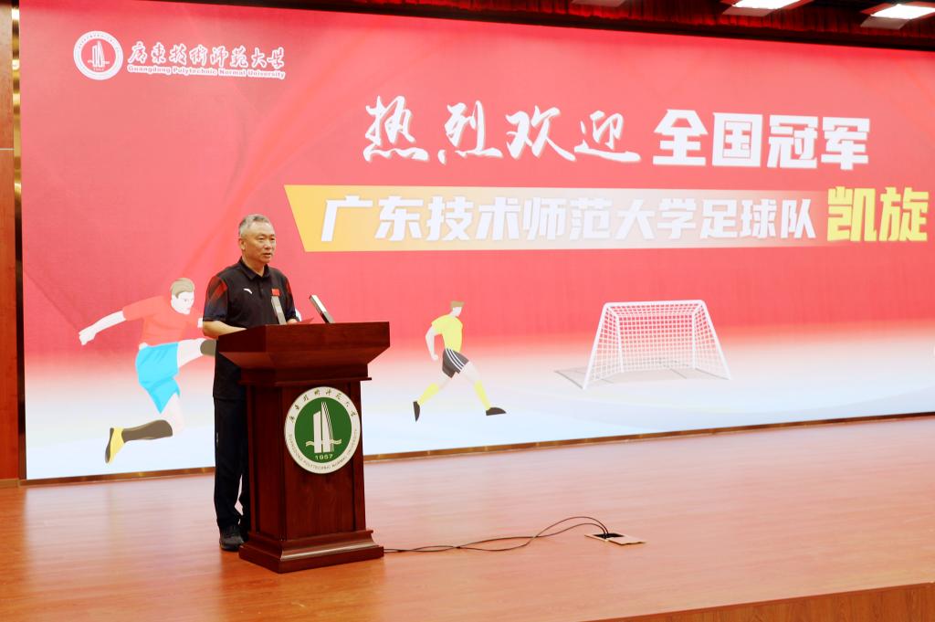 谢昌晶宣读了广东省足球协会的《贺信》并致辞。谢昌晶主席对买球官网男足队在2023-2024年度全国青少年校园足球联赛大学男子校园组全国总决赛中披荆斩棘、勇往无前,问鼎冠军表示衷心的祝贺和感谢。谢昌晶表示,这些成绩是在一代又一代全体广师大人的共同努力奋斗下取得的,希望买球官网以此为契机让足球专业成为传统的特色强项项目,始终在足球改革发展上走在全国高校的前列,为校园足球、广东足球、中国足球作广师大特别的贡献。谢昌晶衷心祝愿我们学校发扬这次足球队在比赛中所体现出来的团结一心、勇往直前、顽强拼搏、敢打硬仗、能得胜利的这种精神,把买球官网的改革发展推向新的高度,不断迈上新台阶。