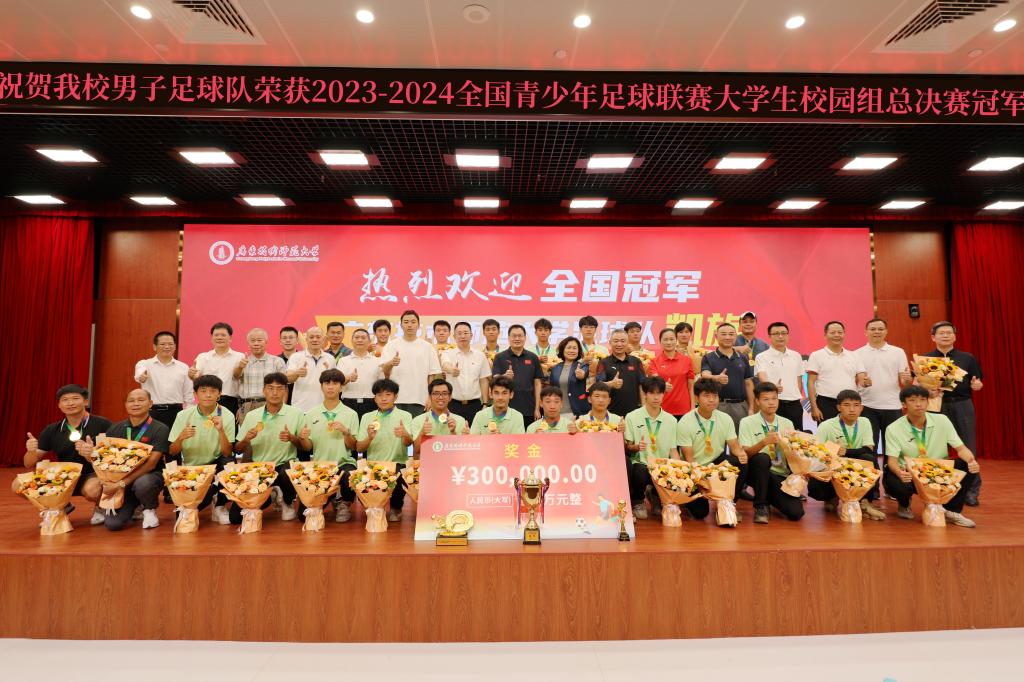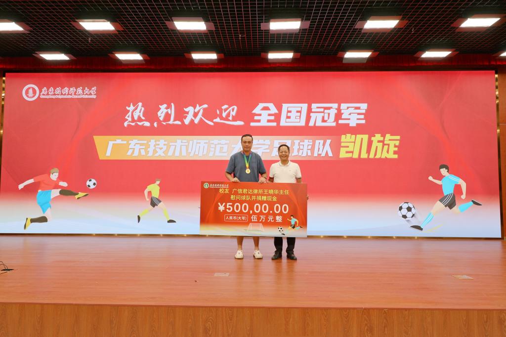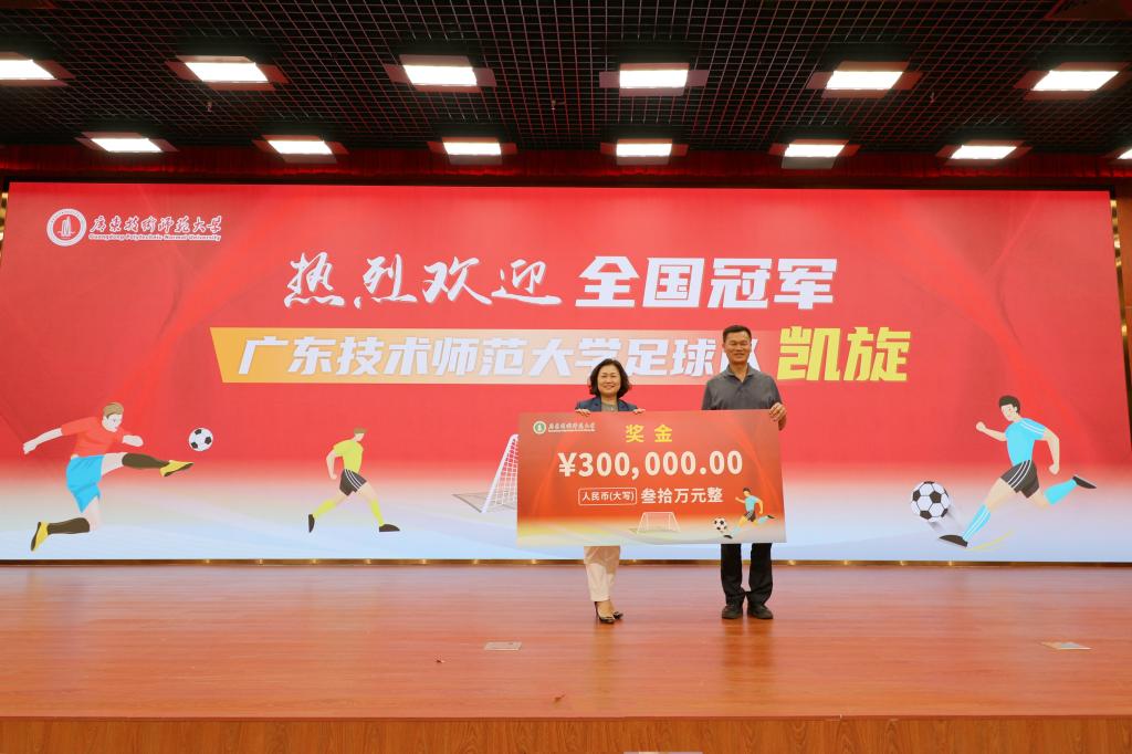 为了表彰冠军队,激励广大师生,激发全体师生干事创业的精气神,学校为男足队颁发奖金30万元,为全体师生员工免费派送4万只鸡腿、8万瓶广师大酸奶。广信君达律师事务所主任王晓华校友捐赠慰问金5万元。