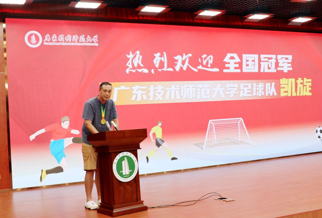 程大欣宣读了广东省教育厅的《贺信》并致辞。程大欣代表省教育厅向顺利凯旋的广师大男足队运动健儿表示亲切的慰问和热烈的祝贺,向一直以来支持关心校园体育工作的广东省体育局、广东省足协表示衷心的感谢。程大欣表示,多年来广东省教育厅在推进我省青少年足球教育工作中做了大量的工作,确保了我省校园足球工作的整体水平,走在了全国的前列。本次广师大男足队夺得全国总冠军,侧面反映了广东青少年足球工作所取得的成绩。