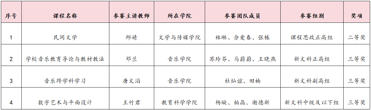 根据《关于第四届全国高校教师教学创新大赛广东分赛暨广东省高校教师教学创新大赛拟获奖名单的公示》,买球官网在第四届广东省高校教师教学创新大赛中取得佳绩,荣获5项荣誉,其中二等奖1项,三等奖3项,优秀组织奖1项。文学与传媒学院邱婧获课程思政正高组二等奖,音乐学院邓兰、唐文滔,教育科学学院王竹君分别获新文科正高组、副高组和中级组三等奖,买球官网获评优秀组织奖。