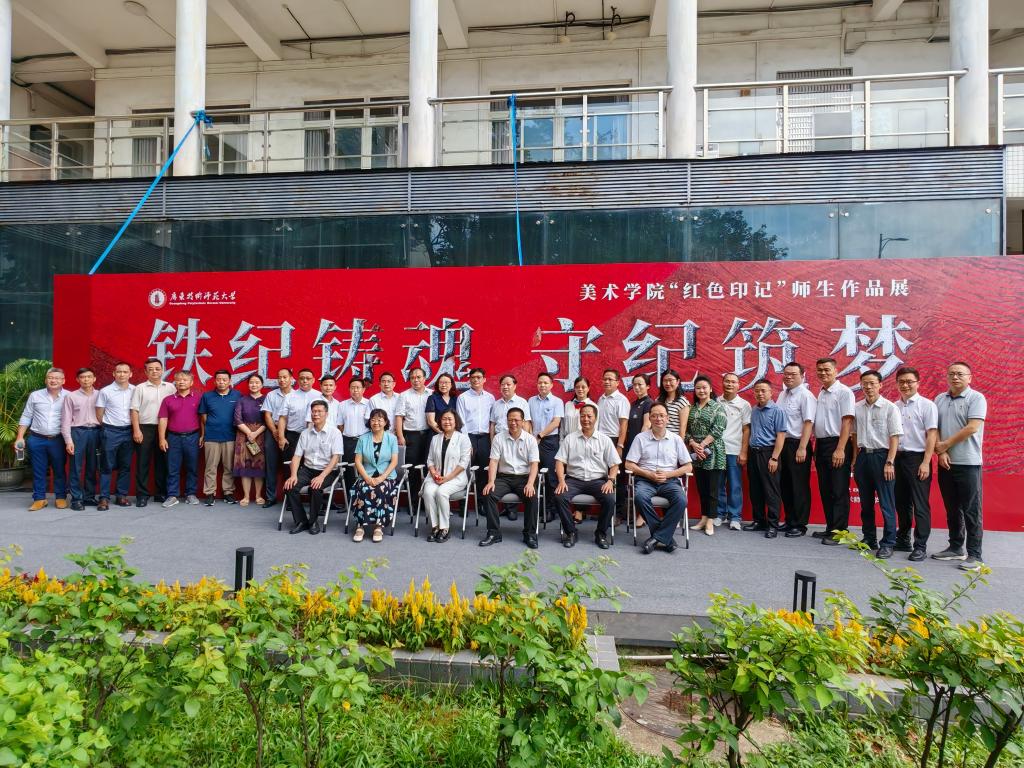 在中国共产党103周年诞辰之际,为持续推进党史学习教育常态化、长效化,推动党纪学习教育走深走实,7月1日,学校党纪学习教育工作专班联动教务处、美术学院等单位精心策划,在学校东校区福慧美术馆举办了“铁纪铸魂守纪筑梦”——红色印记师生作品展。全体校领导、职能部门正职领导、美术学院师生代表等参加了开幕式。