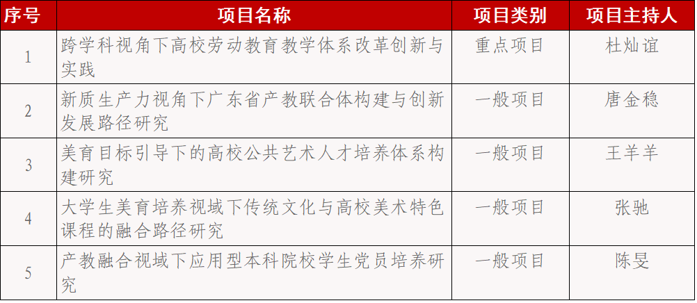 日前,《广东省高等教育学会“十四五”规划2024年度高等教育研究课题拟立项名单公示》发布,经过教师个人申报、教务处初审、组织推荐、统一报送材料、广东省高等教育学会秘书处资格审查、专家组评审,买球官网获得5项立项,其中,重点课题1项,一般课题4项。