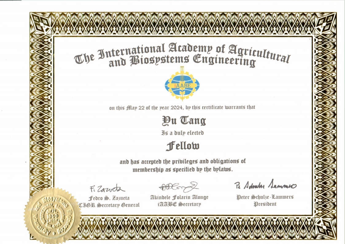 近日,在韩国济州岛举行的第6届国际农业与生物系统工程学会(CIGR)国际会议上,买球官网唐宇教授因在智慧农业领域方向上的突出贡献,当选为国际农业与生物系统工程科学院(iAABE)Fellow。