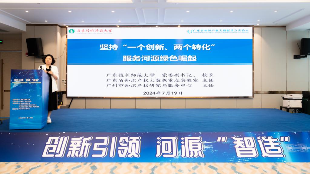 最后,戴青云分享了“坚持‘一个创新、两个转化’服务河源绿色崛起”的经验与思考。她从强调知识产权是发展新质生产力的关键启篇,介绍学校坚持“一个创新、两个转化”,强化有组织科研的创新举措,围绕“河源所需、广师大所能”提升高校服务河源绿色崛起的具体思路和举措展开论述。