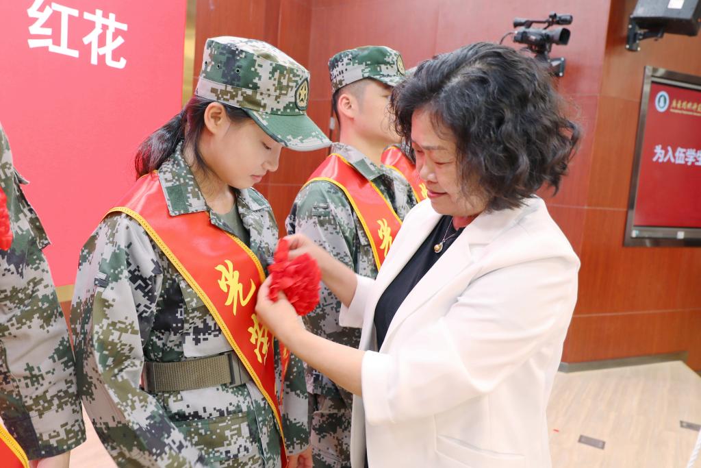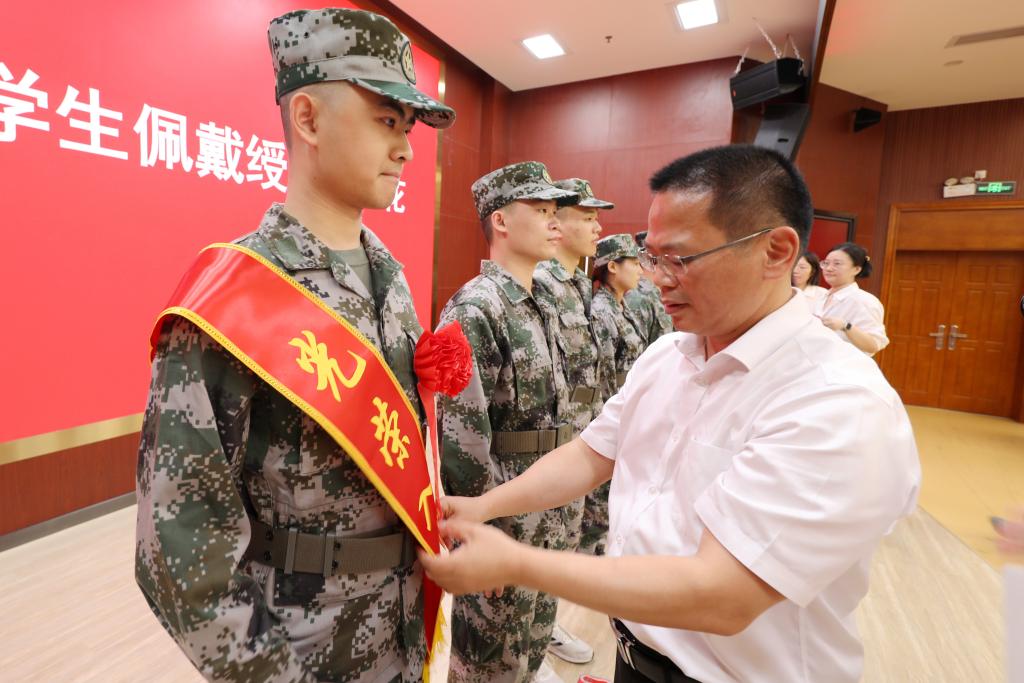 随后,戴青云校长、李向明副书记为预定新兵佩戴绶带和红花,并赠送入伍纪念品。在庄严的氛围中,全体入伍学生坚定地宣读了军人誓词,许下了为国家、为人民、为军队奉献一切的庄严承诺。