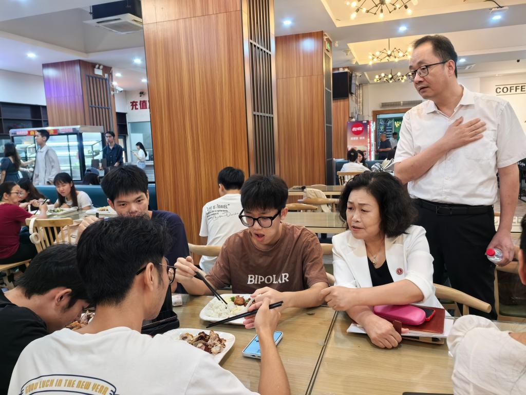 现场办公会后,戴青云一行走进饭堂就餐区并与用餐学生亲切交流,她详细询问菜品价格、口味、食堂员工服务态度、学生学习生活等情况,她鼓励同学们以良好的精神面貌迎接新学期的学习生活,不断提升能力素质,努力成长为堪当民族复兴重任的时代新人。