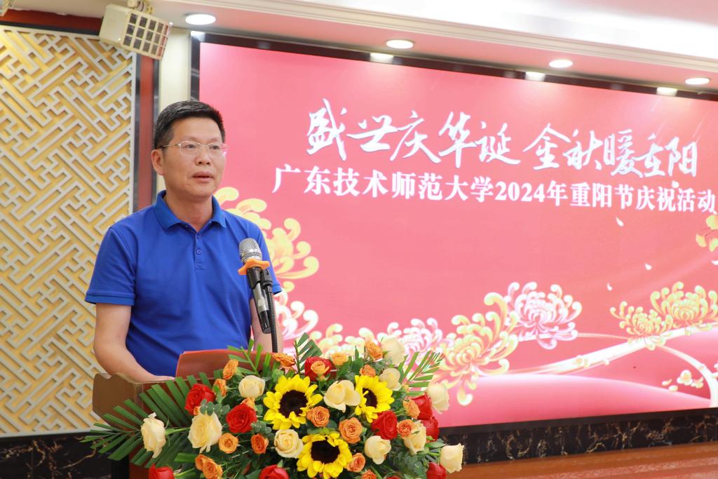苏晖代表学校向32位寿星和全校1023位老同志致以节日的问候和诚挚的祝福,他衷心祝愿寿星、老同志们保重好身体,享岭南之灵秀,增期颐之洪寿。在致辞中,苏晖简要介绍了今年学校在教育教学、科学研究、人才培养、文体竞赛和离退休工作等方面取得的优异成绩,对老同志们为学校建设发展贡献的智慧力量、倾注的辛勤汗水表示衷心的感谢和崇高的敬意。他指出,今年是学校申博的关键一年,希望老同志们继续发挥优势作用,围绕博士学位授予单位建设工作贡献智慧和力量,推动学校事业发展再上新台阶!
