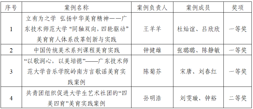 据悉,本次活动是广东省教育厅为贯彻落实《关于全面加强和改进新时代学校美育工作的意见》,进一步深化我省高校美育工作综合改革,形成具有引领性、突破性、示范性的做法、举措和经验,推进全省高校美育工作高质量发展而举办的一项重要活动。本次活动,买球官网党政领导高度重视,教务处(美育中心)精心组织策划,各职能部门及二级学院积极凝练美育建设成果。期间,美育中心特邀请了校内外专家对买球官网4个案例进行多轮打磨,最终在本科组的数百个案例中脱颖而出,获得一等奖3项、二等奖1项。