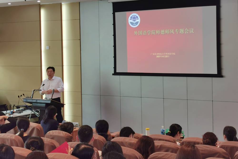 为进一步提升教师思想政治素质和职业道德水平,4月24日,外国语学院在东校区一教209召开了全体教职工大会暨师德师风建设专题会,学院党政领导班子成员、学院全体教师参加会议。会议由学院党委书记杨伟光主持。
