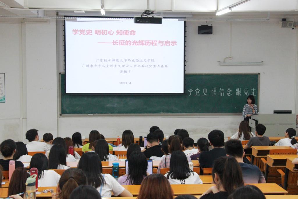 窦畅宇博士以《学党史明初心知使命——长征的光辉历程与启示》为题,围绕中国工农红军长征历程、“长征路上话初心”活动、“学习长征历史感悟初心使命”等三个部分进行宣讲。她带领同学们一起回顾了中国长征历程这部艰苦的奋斗史、理论探索史、洗身建设史,并和同学们分享了她曾经参与的“长征路上话初心”这一思想教育实践活动的经历与体会。同学们被窦博士分享的“红歌”快闪活动、书法展示、走访红军后人和社会调研等具有深厚意义的活动和趣事深深吸引。