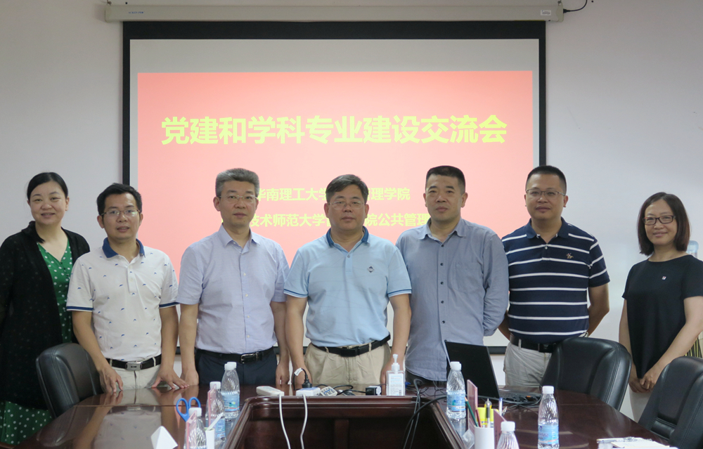 为深入开展党史学习教育,学习借鉴“双一流”高校在基层党建和学科专业建设方面的有益经验,进一步提升基层党建工作和学科专业建设的针对性、特色性和实效性,4月30日,管理学院副院长易建华、公共管理系主任兼党支部书记黄开腾、副主任兼党支部宣传委员阳程文、专业负责人周霞和陈宁等一行五人前往华南理工大学公共管理学院开展党建与学科专业建设交流会。华南理工大学公共管理学院党委书记周勤,副院长黄岩、李胜会等参加了座谈交流。