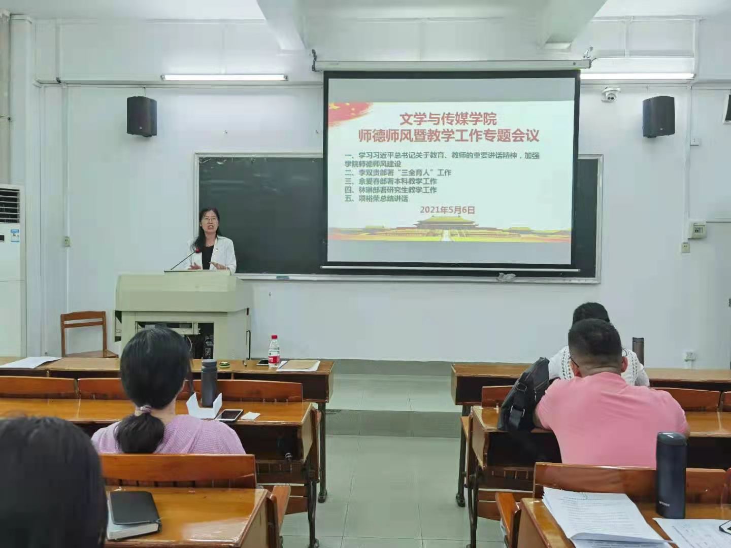 为深入贯彻落实习近平总书记重要讲话精神,落实立德树人根本任务,树立优良师德师风,提高教育教学质量,5月6日,文学与传媒学院在东校区一教105教室召开师德师风暨教学工作专题会议。学院党政领导班子成员、学院全体教师参加会议。会议由学院党委书记李双贵主持。