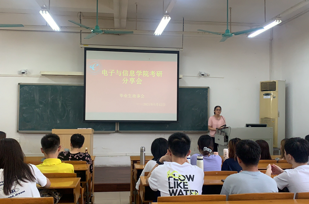 5月12日下午,电子与信息学院在东校区二教305教室举办了毕业生故事荟系列活动之考研交流分享会。学院党委副书记梁茵、辅导员韩琼、2021届考研成功的学生代表及50多名有意向考研的同学参加分享会。