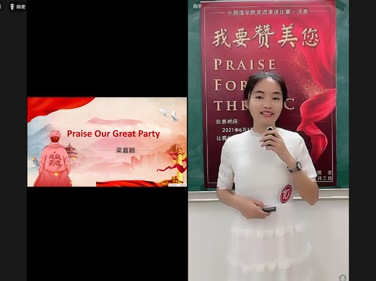 “我要赞美您”英语演讲比赛是2021年广师大外语文化节系列活动之一,外国语学院严格落实疫情防控措施,将党史学习教育与专业学习相结合,线上举办决赛,丰富学习载体,推进党史学习教育走深走实走心。