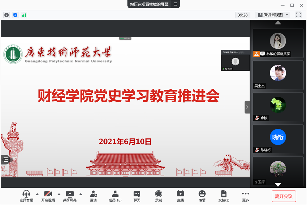 为贯彻落实省委教育工委及学校党史学习教育工作部署要求,总结回顾学院党史学习教育前一阶段的工作,对下阶段工作进行再动员再部署,推动党史学习教育取得新进展新成效,6月10日,财经学院党委召开线上党史学习教育推进会。学院党委委员和全体支部书记参会,会议由学院党委书记吴松主持。