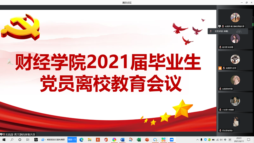 6月11日,财经学院在腾讯会议平台召开2021届毕业生党员离校教育大会。财经学院党委副书记黄伟文、学院专职组织员、辅导员林敏、负责就业工作辅导员吴士杰、财经学院2021届全体毕业生党员参加本次会议。