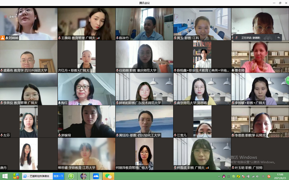 8月20日—23日,由研究生院、教育科学与技术学院举办的“2021年广东省职业技术教育学研究生学术论坛”在腾讯会议平台圆满举办。研究生院院长陈泳竹教授、教育科学与技术学院院长陶红教授、项目负责人谢德新副教授和主持人团队,以及正式录取的来自南京师范大学、华南师范大学、江苏大学、浙江师范大学、河南师范大学、云南师范大学、重庆师范大学等国内11所高校的70名研究生参加论坛。