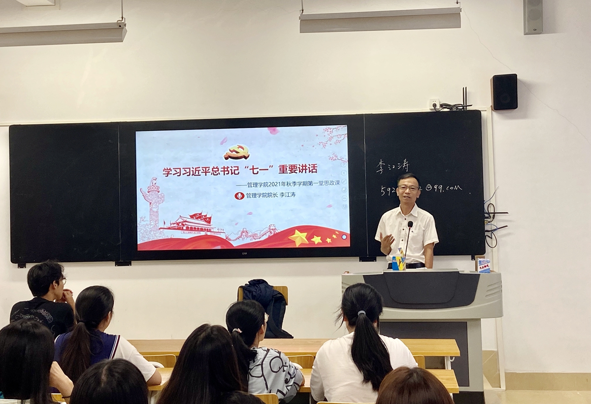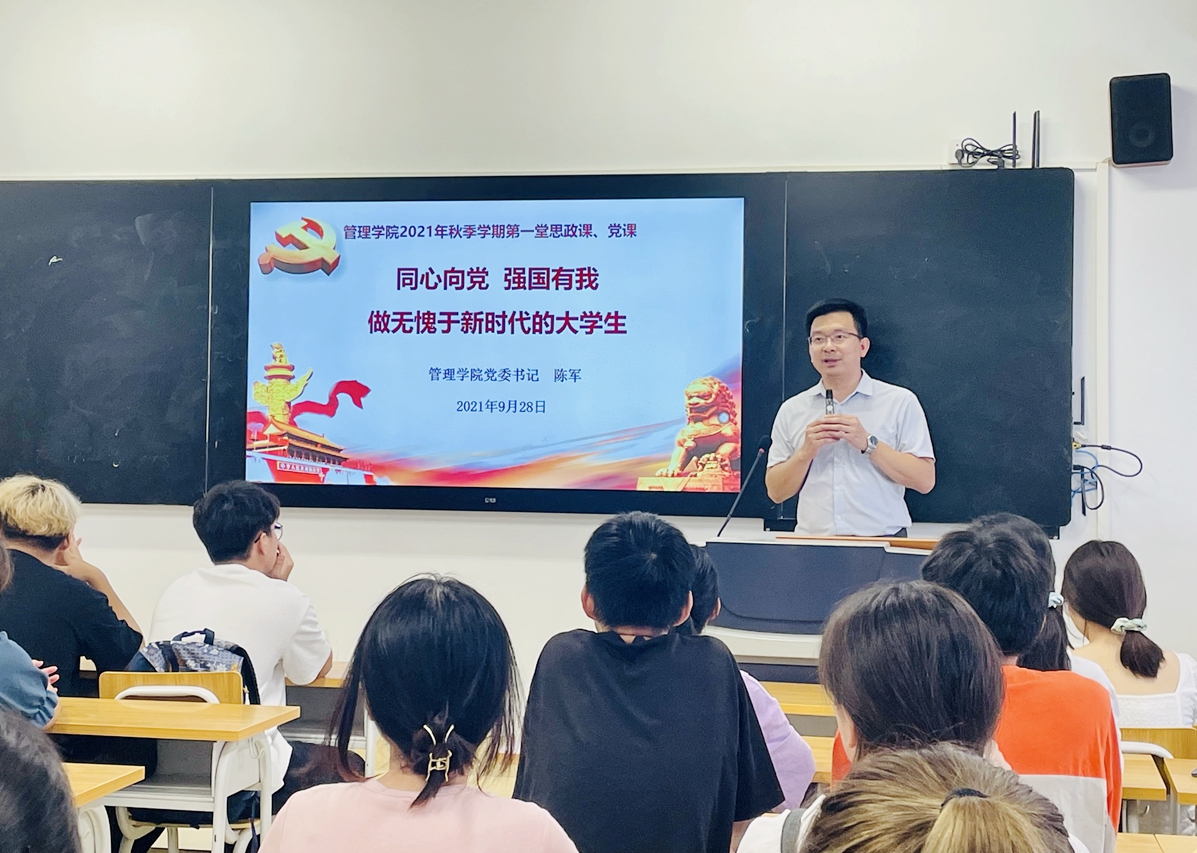 为深入学习贯彻习近平总书记在庆祝中国共产党成立100周年大会上的重要讲话精神,让广大青年学生深入认识和了解党史,树立正确的党史观,9月28日,管理学院党委书记陈军、院长李江涛在河源校区为2021级新生讲授2021年秋季学期“思政第一课”,学院河源校区辅导员、2021级新生近150人聆听了讲座。
