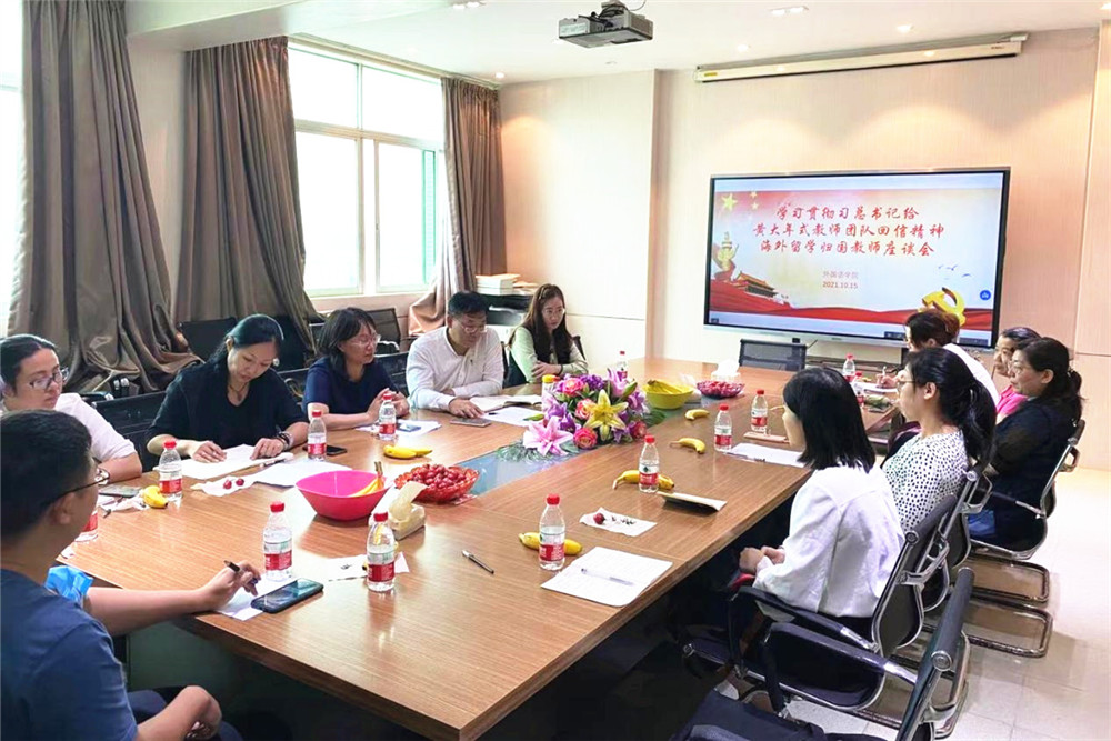 为深入学习贯彻习近平总书记在中央人才工作会议重要讲话精神和习近平总书记给全国高校黄大年式教师团队代表回信重要讲话精神,切实加强人才队伍建设和师德师风建设,10月15日,外国语学院在东校区第一教学楼1212室举行海外归国教师座谈会,会议由外国语学院党委书记杨伟光主持,学院党委中心组成员以及海外归国教师20余人参加了会议。