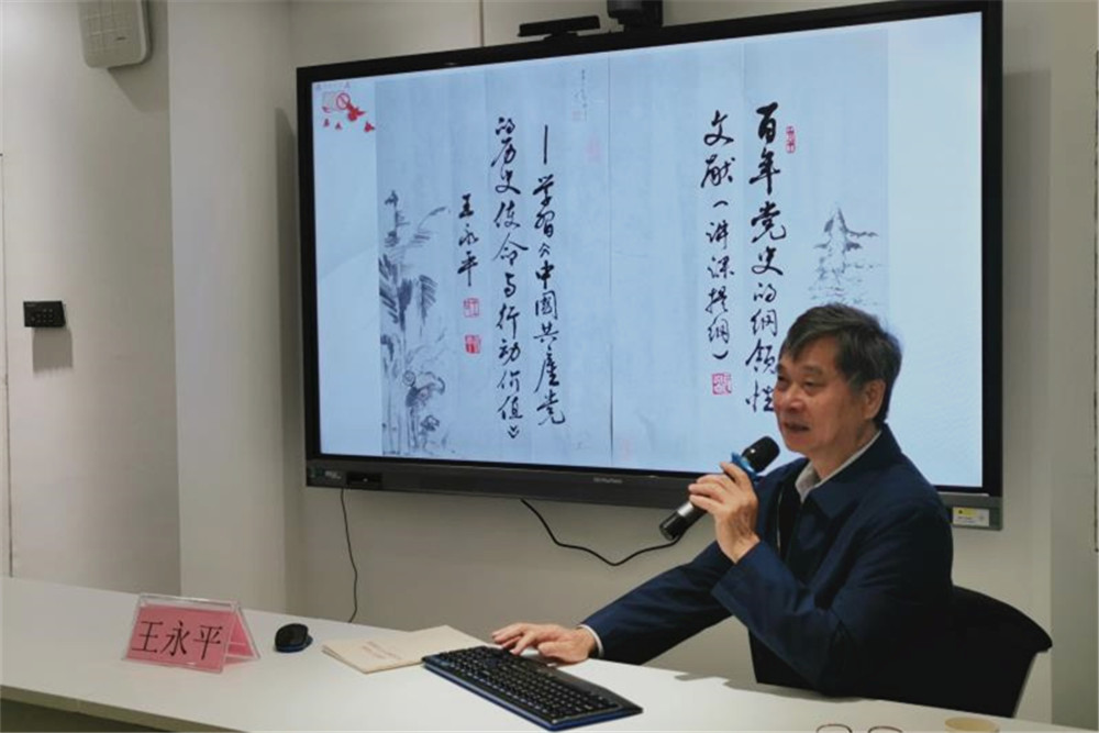 王永平研究员在讲述的过程中声情并茂,用自己的亲身经历结合中国共产党的发展历史,向大家讲述了中国共产党一百年峥嵘岁月里无数可歌可泣的故事。他指出,100年来中国发生沧桑巨变,换了人间。产生这一巨变的根本原因,在于有了中国共产党。他用幽默风趣的语言向大家精彩阐述了《中国共产党的历史使命与行动价值》的主要内容,并从全心全意为人民服务、为实现理想不懈奋斗、具有强大的领导力执政力、始终保持旺盛生机和活力、为人类和平与发展贡献力量这五个方面深度解读了中国共产党是什么样的政党。王永平研究员还通过书法作品来作课件的形式为大家呈现了不一样的《中国共产党的历史使命与行动价值》,让大家在收获知识与智慧的同时,也感受到中国书法的魅力。