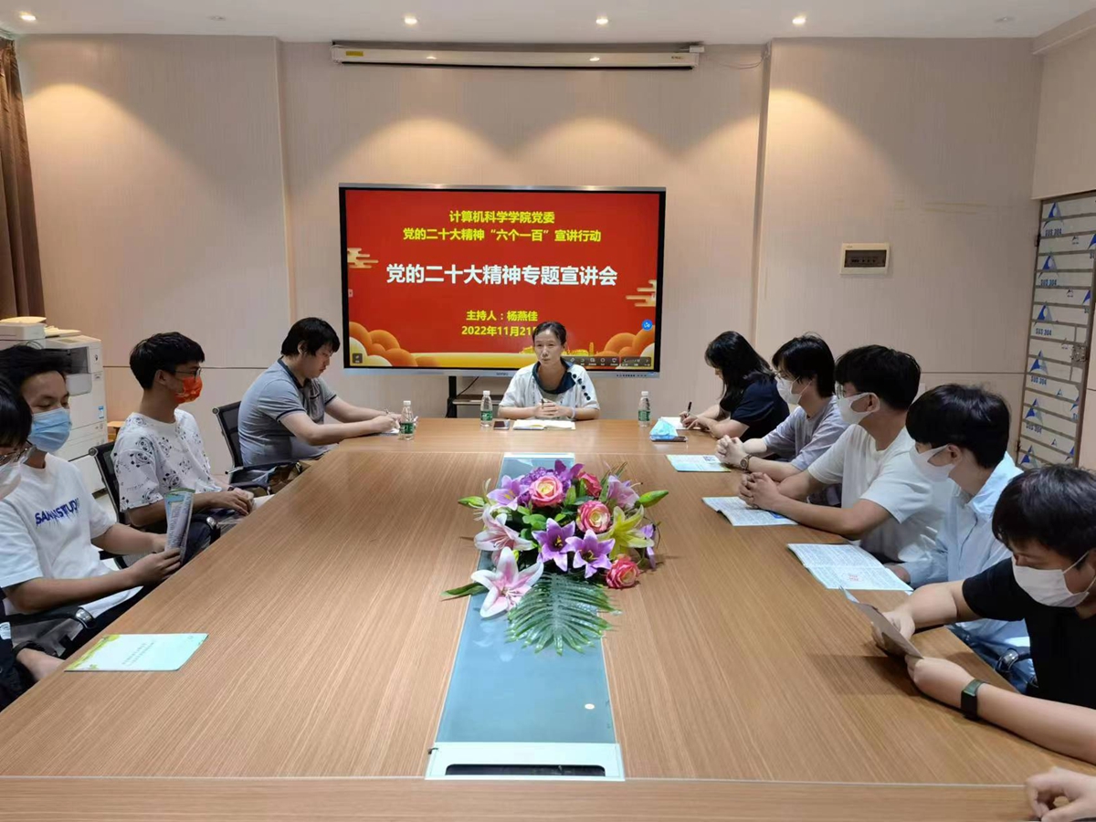 为深入学习与领悟党的二十大精神,贯彻落实《买球App软件手机在线下载党的二十大精神“六个一百”宣讲行动实施方案》,11月21日,计算机科学学院在学院会议室面向研究生开展了党的二十大精神宣讲及疫情防控专题教育会议。学院党委副书记杨燕佳、辅导员、研究生参加了会议。