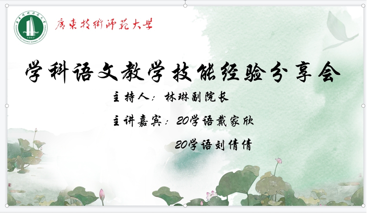 11月26日,为增强学生之间交流,提升学生专业素养,丰富课余生活,文学与传媒学院“学科语文教学技能经验分享会”在云端举行。本次会议由2022年“田家炳杯”全日制教育硕士教学技能大赛二等奖的获得者,2020级学科语文专业戴家欣同学与刘倩倩同学主讲,学院副院长林琳主持,2021级和2022级40余位学科语文专业研究生参与旁听与交流。
