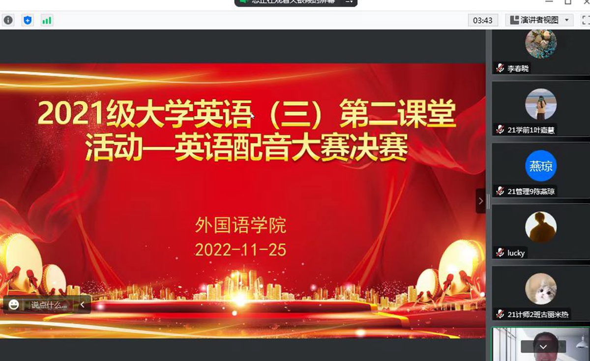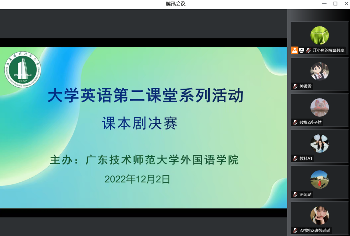 为进一步丰富校园文化生活,营造良好的英语学习氛围,深入推动买球官网大学英语教学改革工作,11月25日,外国语学院大学英语部线上举办了大学英语第二课堂系列文化活动,东校区、白云校区、西校区、河源校区同时进行。学校大一、大二年级分别举办了英语课文剧和英语配音赛事,买球官网242个英语班,近3000名学生参与比赛。经过激烈角逐,219组队伍入围复赛,最终27组队伍进入决赛,学生参赛热情高涨。决赛由外国语学院教师担任评委,全校师生均可在线观看。