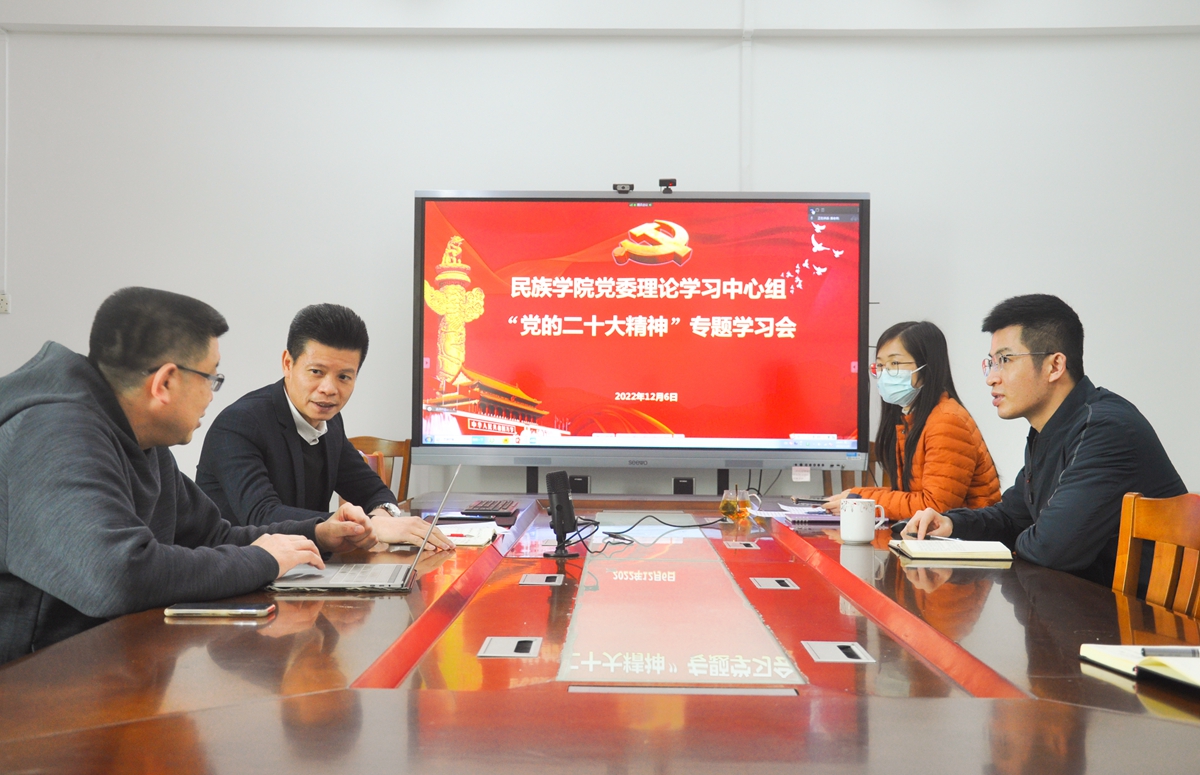 12月6日,民族学院党委理论学习中心组召开会议,进一步学习贯彻落实党的二十大精神,会议由学院党委书记黄文浩主持,民族学院党政班子成员、党委委员、学院分工会主席、教工和学生党支部书记等参加会议。