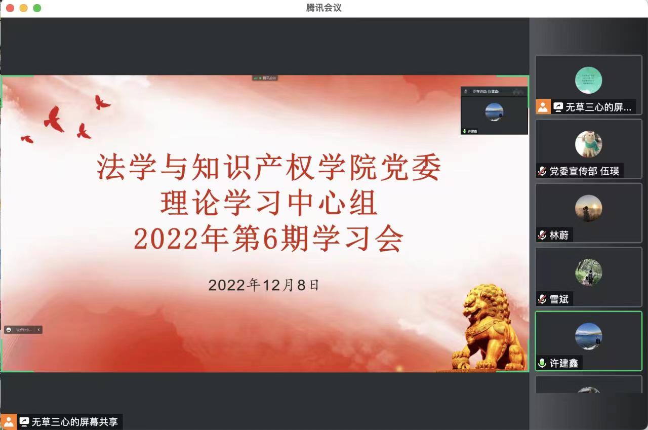 12月8日,法学与知识产权学院以线上会议方式召开党委理论学习中心组2022年底6期学习会,深入学习党的二十大精神。法学与知识产权学院党政班子成员、党委委员、党支部书记、党政办公室主任等参加会议,学校党委宣传部伍瑛老师列席会议。会议由学院党委书记许建鑫主持。