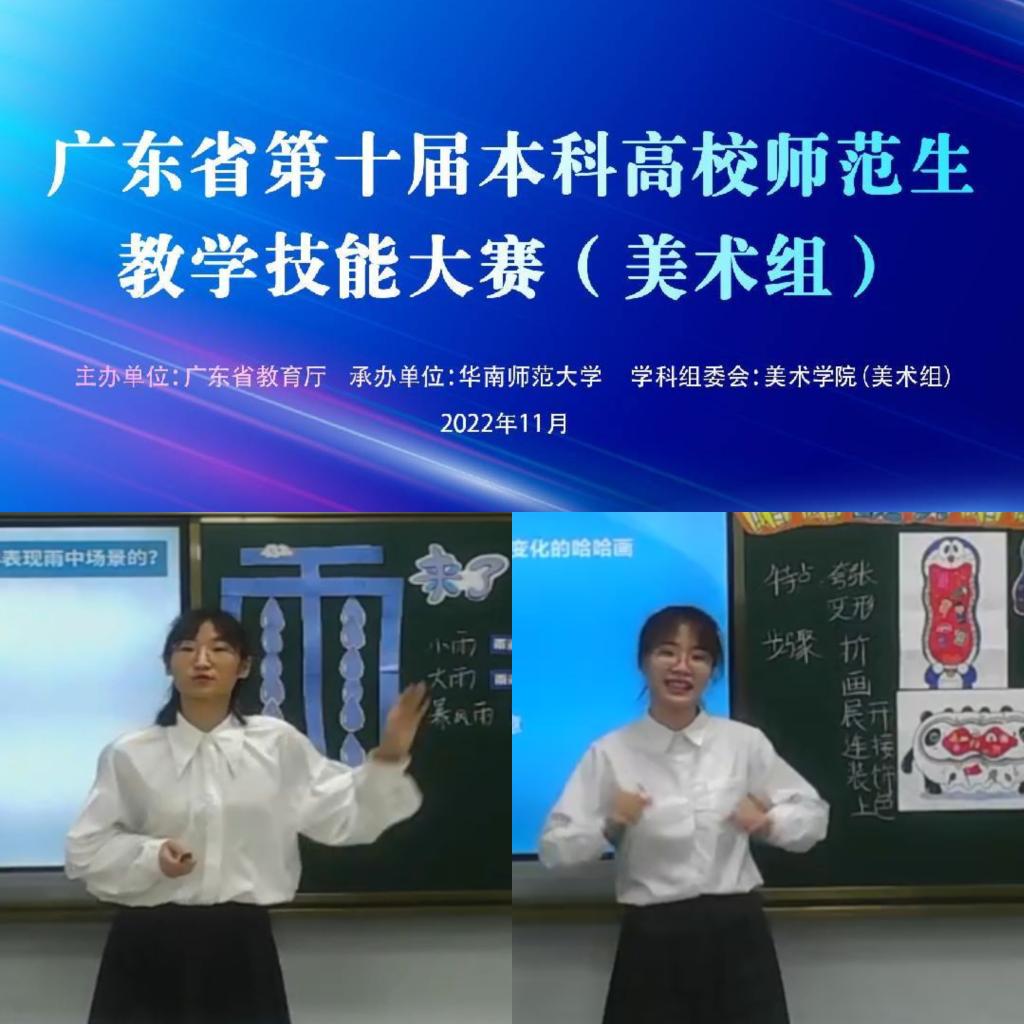 11月20日,在广东省教育厅主办的2022年“第十届广东省本科高校师范生教学技能大赛决赛”中,美术学院禤洁谊、杨辰硕两名同学在美术组决赛中均获三等奖。