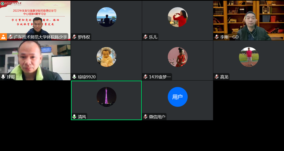 12月16日上午,体育与健康学院党委理论学习中心组在线召开以“学习贯彻党的二十大精神,推动学校体育高质量发展”为主题的学习会,学院党委委员、专职组织员等分别作主题发言,行政办公人员和教研室主任列席学习会,学院党委书记陈少宇主持会议。