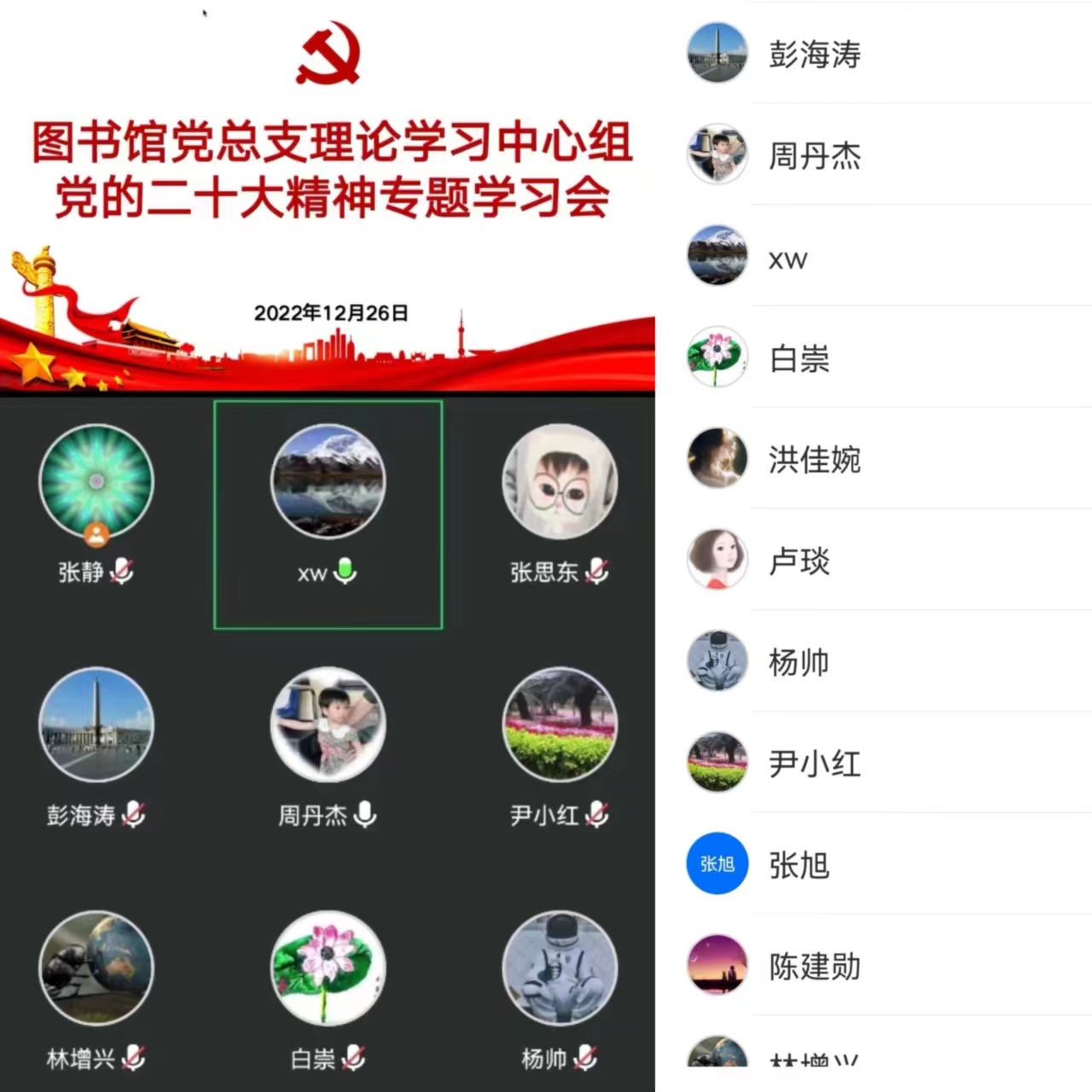 12月26日下午,图书馆党总支通过线上会议方式召开理论学习中心组扩大会议,专题学习宣传贯彻党的二十大精神,图书馆党总支委员、党支部书记、各部门主任和青年博士代表参加了学习会,学校党委宣传部伍瑛老师列席旁听会议。会议由图书馆党总支书记谢蔚主持。