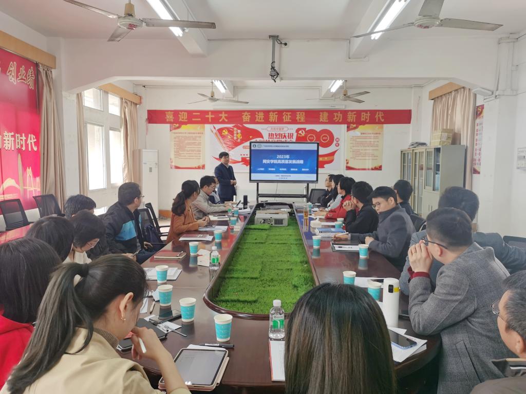 会议上,学院党委书记陈小花带领全体教师学习了党的二十大精神和习近平总书记关于高质量发展的重要论述,以及省委书记黄坤明在1月28日广东省高质量发展大会上的讲话,并传达了学校党委书记凌靖波、校长戴青云在学校高质量发展战略研讨会上面作出的工作部署和要求。她表示,在学院高质量发展的道路上,要在每项工作的推进实施上奋力跑出“加速度”,在学院老师的成长进步中奋力干出“高效能”,在学院高质量建设目标中奋力创出“好成绩”,在学院发展长远规划中奋力展现“新精彩”。