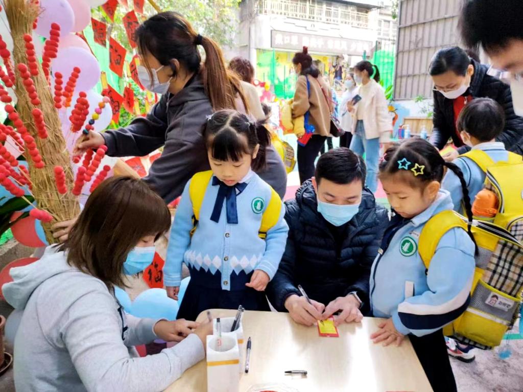 开学日当天,幼儿园全体老师早早地来到大门处等候,向回归幼儿园怀抱的萌娃们送上健康成长的美好祝福。在完成入园晨检后,孩子与家长在引导下参与到“迎新接福”活动中,使用老师们提前准备好的卡片纸、彩带条以及红绳子等手工材料自行动手组装开学福袋,并将新年寄语写在福袋上;此外,幼儿园还为每位小朋友准备了“摸一摸,好运来”活动,孩子们亲手抚摸代表吉祥寓意的苹果、桔子、大葱以及棒棒糖,寓意在新的一年平平安安、大吉大利、聪明伶俐、身体棒棒。充满“仪式感”的入园礼让孩子们倍感亲切与温暖,也让大家的欢声笑语充满了整个校园。
