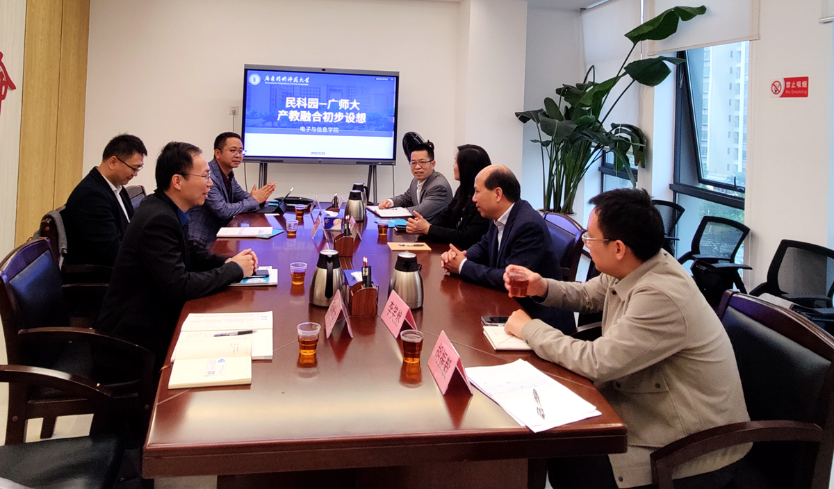 电子与信息学院党政班子领导首先参观了广州民营科技创展中心,了解广州民营科技园园区定位、发展历程、产业体系、企业进驻情况、未来发展愿景等。随后,双方举行交流座谈会。会上,罗旭辉、单纯分别介绍了学院的发展历程、师资力量、办学规模、人才培养以及毕业生基本情况等,期待与广州民营科技园在人才、技术、服务、培训等领域加强合作交流,强化校企合作,深入推动产教融合。李亚作了题为《民科园——广师大产教融合初步设想》的专题报告,李亚结合前期对白云区产业调研和广州民营科技园发展概况以及电子与信息学院的实际情况,从“产业需要什么”“我们能做什么”“如何服务民科园”三个方面介绍了双方推动产教深度融合发展的基本优势、潜在机会和未来合作方向,希望双方在人才培养、科研平台建设等方面共建共融共享、互通互惠互利。