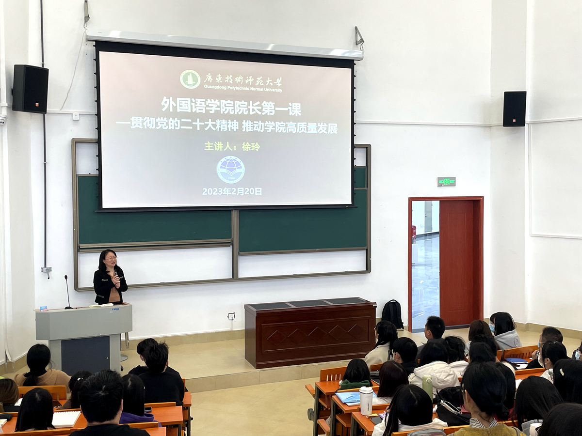 为认真学习贯彻党的二十大精神,根据学校高质量发展战略研讨会要求,致力于高质量学院发展与学生成长成才,近日,外国语学院党委书记杨伟光与院长徐玲为河源校区2022级学生讲授了“思政第一课”,学院党政领导班子相关成员、辅导员和学生代表450余人现场聆听了讲课。